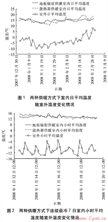 在建筑結(jié)構(gòu)、熱工性能、供暖面積、生活習(xí)慣相近的條件下,對分別采用散熱器、地板輻射供暖、散熱器+吊炕、散熱器+火炕供暖方式的室內(nèi)小時平均溫度進行實測。在連續(xù)最冷7日內(nèi),采用散熱器供暖、地板輻射供暖的農(nóng)村居民室內(nèi)小時平均溫度較高,受室外溫度的影響較小,且地板輻射供暖熱穩(wěn)定性最好。采用散熱器+吊炕供暖的室內(nèi)溫度比采用散熱器+火炕供暖的室內(nèi)小時平均溫度高,但采用這兩種供暖方式的室內(nèi)小時平均溫度波動性較大。
