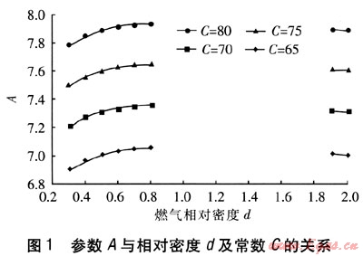 對(duì)于常用的城市燃?xì)鈿庠?,人工煤氣的相?duì)密度一般為0.3~0.55,天然氣的相對(duì)密度為0.5~0.8,液化石油氣的相對(duì)密度為1.9~2.0,與燃具幾何參數(shù)有關(guān)的常數(shù)C一般為65~80。當(dāng)燃?xì)庀鄬?duì)密度為[0.3,0.8]及[1.9,2.0],考慮常數(shù)C=65,70,75,80四種情況,繪制A與d的關(guān)系曲線,見(jiàn)圖1。可以看出,在所考慮的范圍內(nèi),A并非為一定值,而是隨著相對(duì)密度的增大而有所變化。因此,利用式(1)和(3)來(lái)計(jì)算一次空氣系數(shù),必然會(huì)引起計(jì)算誤差。