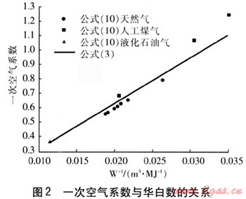 成正比,與理論空氣需要量V0成反比,由于V0與Qh成正比,因此α1與Qh成反比,故一次空氣系數(shù)α1就與華白數(shù)W成反比。 在文獻(xiàn)[7]中,一次空氣系數(shù)α1與