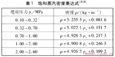 飽和蒸汽不同于理想氣體,不能通過氣體狀態(tài)方程來計算其密度;也不同于過熱蒸汽,不能用以溫度和壓力為自變量的近似公式來計算其密度;只能用以溫度或壓力為自變量的近似公式來計算其密度。以壓力為函數的飽和蒸汽密度表達式見表1,飽和蒸汽密度表達式在相應的壓力范圍內精度比較高。