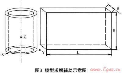 將問題簡化為等截面直肋導熱問題后,為便于求解,首先需確定直肋的高度、寬度、厚度、周邊長度及橫截面積。將鋼管沿著軸向垂直剖開后,變成以管周長(L)為寬,以管長(B)為高度,以管道壁厚(δ)為長度的直肋模型,如圖3所示。