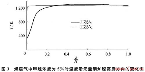 在3種工況條件下,h/H大于0.05時爐膛溫度均大于840K,而甲烷的著火溫度為811K。當爐膛的溫度大于甲烷的著火溫度時就可以維持燃燒,這說明在煤層氣中甲烷濃度不低于3%時,利用流態(tài)化蓄熱裝置可以維持燃燒。對計算區(qū)域溫度取平均值并定義為爐膛的平均溫度,當煤層氣中甲烷濃度為5%、4%、3%時,爐膛的平均溫度分別為1256K、1080K、842K。煤層氣中甲烷濃度由5%下降到4%時,爐膛平均溫度下降,溫度下降值△T1為176K;煤層氣中甲烷濃度由4%下降到3%時溫度下降值△T2為238K。可見,隨著煤層氣中甲烷濃度的下降,溫度降低,并且下降幅度有增大趨勢,可以判斷,當煤層氣中甲烷濃度低于3%時,爐膛溫度迅速降低并低于甲烷的著火溫度811K,無法維持煤層氣在爐膛中的燃燒,這和數值模擬中當煤層氣中甲烷濃度低于3%時不能燃燒的計算結果是一致的。所以流化床蓄熱裝置燃燒超低濃度煤層氣的著火極限濃度為3%。