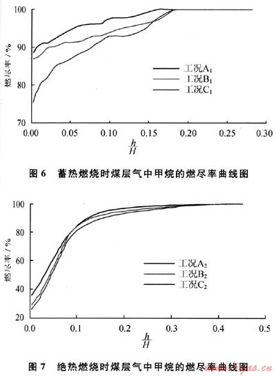 從圖3~5中還可以看出,采用蓄熱式燃燒時,煤層氣中甲烷濃度為5%、4%、3%的最高溫度分別為1270K、1100K、867K,最高溫度分別出現在h/H為0.18、0.19、0.2附近。而h/H為0.2是惰性顆粒形成床層的近似高度,由此可知,最高溫度出現的位置在床層的上部,并隨著煤層氣中甲烷濃度的降低略向上移,這是與煤層氣中甲烷的燃燒位置分不開的。從圖6中可以看出,隨著煤層氣中甲烷濃度的降低,甲烷完全燃盡的位置逐漸向上推移,由此造成在爐膛中出現最高溫度的位置逐漸上移。這是由于隨著煤層氣中甲烷濃度的降低,爐膛的溫度和石英砂顆粒的溫度降低,這樣就推遲了煤層氣中甲烷從點火到完全燃盡所用的時間,在流量一定的情況下,甲烷完全燃盡所出現的位置便向上推移,從而使最高溫度出現的位置向上推移。如圖6所示,在A1、B1、C13種工況下,h/H為0.2位置處,煤層氣中的甲烷燃盡率都接近100%,說明煤層氣中的甲烷在惰性顆粒組成的床層以內就基本完成了燃燒反應。