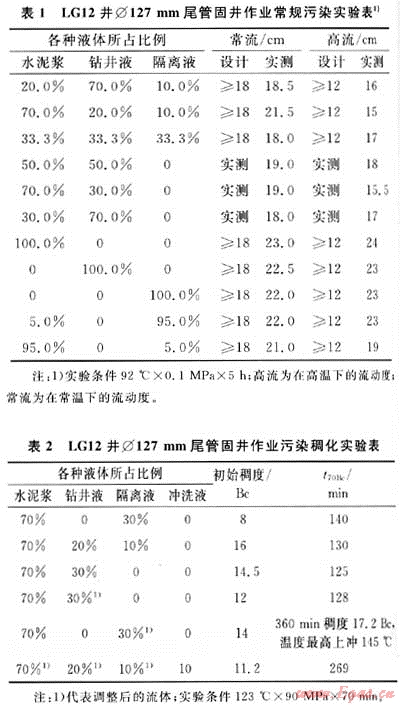 3) 必須開展隔離液與水泥漿的污染稠化實(shí)驗(yàn),保證隔離液對(duì)水泥漿的稠化時(shí)間無不良影響,避免固井工程事故的發(fā)生。