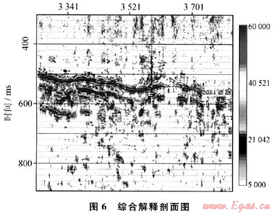 為更好地突出煤層氣AVO異常,把截距、梯度數(shù)據(jù)體進(jìn)行相減運(yùn)算,取差值的振幅包絡(luò)屬性作圖,獲得綜合解釋剖面圖(圖6)。由于煤層氣的AVO異常特點(diǎn)是截距與梯度符號相反,因此差值增強(qiáng)了與煤層氣富集相關(guān)的AVO異常,而削弱AVO反演噪音。截距、梯度差值的包絡(luò)屬性,將把頂、底板反射界面相關(guān)的同相軸異常合并顯示為同一個同相軸,突出了AVO異常范圍。圖6中沿2條藍(lán)線(即5#煤層頂板、底板的位置)的紫紅色位置是煤層氣富集區(qū)。