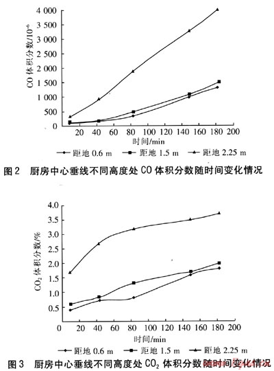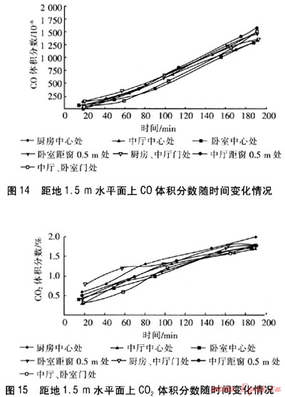 在距地面1.5m水平面上共有7個測點,C0最高體積分數(shù)為0.157%,位于中廳距窗0.5m處測點;02最低體積分數(shù)為17.7%,位于中廳距窗0.5m處測點;C02最高體積分數(shù)為2.0%,位于廚房中心處測點。C0、C02體積分數(shù)隨時間的增加呈上升趨勢,02體積分數(shù)隨時間的增加而下降。在同一水平面上,室內(nèi)各點的C0、C02體積分數(shù)較接近。說明在這一水平面上,煙氣的擴散速度較快,各點的污染物體積分數(shù)較均勻。