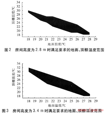 對(duì)于房間高度分別為2.8、3.1、3.4、3.7m的房間模型,根據(jù)模擬結(jié)果,求出0.5、1.8m斷面上平均PPD,將滿(mǎn)足要求的地面、頂棚溫度點(diǎn)繪成圖形。其中,2.8m、3.4m高房間的溫度范圍見(jiàn)圖2。