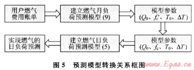 通常,燃?xì)庳?fù)荷的月負(fù)荷預(yù)測模型比較容易建立。因?yàn)椋ㄟ^統(tǒng)計(jì)待預(yù)測地區(qū)的月燃?xì)赓M(fèi)用賬單,就能夠比較方便地建立月負(fù)荷預(yù)測模型。相反,由于目前我國城市燃?xì)庳?fù)荷計(jì)量體系尚不完備,因此燃?xì)馊肇?fù)荷計(jì)量數(shù)據(jù)的收集較為困難,這也給燃?xì)馊肇?fù)荷的預(yù)測帶來諸多不便。所以我們可以利用上述方法,通過預(yù)測模型(9)來間接地得到燃?xì)馊肇?fù)荷預(yù)測模型,從而實(shí)現(xiàn)燃?xì)馊肇?fù)荷預(yù)測。其轉(zhuǎn)換關(guān)系如圖5所示。