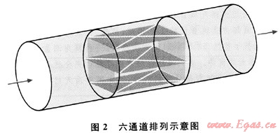 1) 與三、四聲道流量計相比,以特別方式排列的六聲道超聲波流量計有以下的決定性優(yōu)點:①抗干擾性。根據(jù)高斯-切比雪夫(Gauss-Chebyshev)理論排列聲道,并且聲道相互交叉,使流量計很大程度上不受氣體流型的影響。因此,可以不需要整流器甚至在氣體流動受到渦流、不對稱等干擾的情況下也可以實現(xiàn)高精度的測量。②冗余性。如果其中任何一個或兩個聲道失效,六聲道流量計將不會失去計量能力,失效的聲道可以通過重新復值來得到恢復。