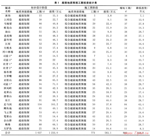 在保證工程安全的情況下,對比初步設計和施工圖設計,西氣東輸二線隧道工程初步設計階段采用單一的超前鉆探進行地質(zhì)預報,初步設計階段實施超前地質(zhì)預報措施的工期及投資見表1;西氣東輸二線隧道工程施工圖設計階段采用綜合超前地質(zhì)預報,施工圖設計階段實施綜合超前地質(zhì)預報措施的工期及投資見表1[9~12]。