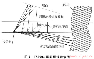TSP203是目前公認為預報效果較好的儀器,其原理是利用地震波在不均勻地層的界面產(chǎn)生反射波的特征和信號接收的時間等參數(shù)來判斷前方的地質(zhì)變化。TSP屬于長距離超前地質(zhì)預報,其有效深距可達150~300m,預測距離在100m左右是比較準確的。在不良地質(zhì)體定位上,最大分辨率不小于1m;位置判別精度約為90%,其規(guī)模判別精度可達85%;TSP203型儀器可辨識出斷層、有無地下水、多水、少水、弱富水帶和強富水帶等,而對突涌水量和水壓的定量預測,仍需結合其他探水手段進行[5];探測成果準確度取決于準確的操作與圖像解釋技術。