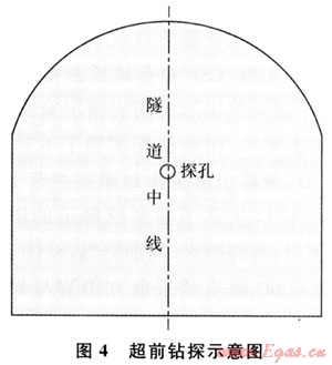 該方法屬于施工過程中的短距離地質(zhì)預報方法,需要采用超前鉆孔進行驗證。由于西氣東輸二線隧道斷面較小,沿掌子面打超前水平探孔1個。超前鉆探示意圖如圖4所示。