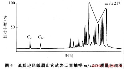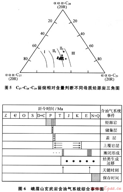 另?yè)?jù)玄武巖瀝青的m/z217質(zhì)量色譜圖(圖4),規(guī)則甾烷呈近“V”字形,C27占優(yōu)勢(shì),反映水生生物輸入有機(jī)質(zhì)較多,利用C27-C28-C29甾烷相對(duì)含量判斷烴源巖母質(zhì)類型(圖5),表明除水生生物外,還有部分腐殖型有機(jī)質(zhì)的輸入;由于上覆的沙灣組在漢王場(chǎng)-青神-犍為-珙縣以東地區(qū),已相變?yōu)楹谏?yè)巖夾薄層石灰?guī)r,有時(shí)可見(jiàn)薄層碳質(zhì)頁(yè)巖和煤層[3],故推測(cè)氣源可能有上二疊統(tǒng)煤系地層的貢獻(xiàn)。