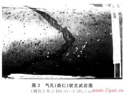多見(jiàn)于杏仁狀、氣孔(杏仁)狀玄武巖中(圖2),高溫玄武熔巖冷凝時(shí)氣體不斷向上排出,上部熔巖溫度下降快,成巖后使氣體封閉在巖體中形成氣孔;后因熱液作用和重結(jié)晶作用部分氣孔被次生礦物所充填,這種半充填的杏仁和未充填的氣孔是玄武巖原生孔隙的主體,但多是孤立的,需靠裂縫溝通。