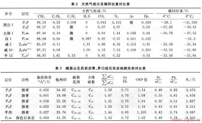 周公山玄武巖氣藏生產(chǎn)至今已愈17a,屬次生氣藏為學(xué)界共識(shí),但氣源來(lái)自何層尚有歧義[3、5]。據(jù)表2可知,周公1井玄武巖與威遠(yuǎn)震旦系氣組成差別大,后者N2、CO2、H2S、He含量高,CH4低,多數(shù)人認(rèn)為氣源主要來(lái)自寒武系筇竹寺組,而川西南部地區(qū)受加里東運(yùn)動(dòng)影響,該套烴源巖剝蝕,殘余厚度僅0~70m。天然氣碳同位素揭示,玄武巖天然氣具油型氣特征,與川西南部上三疊統(tǒng)天然氣碳同位素有明顯差異。地面露頭地化分析(表3)表明,玄武巖瀝青苗的飽和烴色譜均以正構(gòu)烷烴為主,主峰都為nC17奇碳數(shù)優(yōu)勢(shì),Pr/Ph為0.69、Pr/nC17為0.43、Ph/nC18為0.74、∑nC21-/∑nC21+為1.44、Ro為3.067%,與下伏的下二疊統(tǒng)石灰?guī)r具良好的親緣關(guān)系,推測(cè)烴源來(lái)自下二疊統(tǒng)。