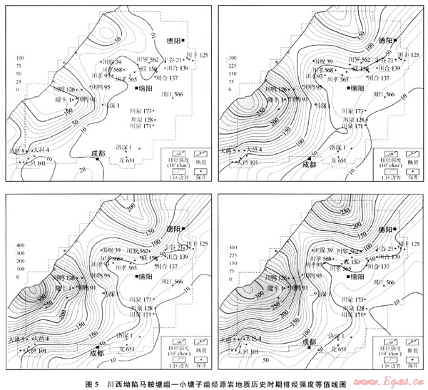 3) 排烴速率指單位體積烴源巖埋深增大100m期間排出烴量,10g/100m,反映地史過程中烴源巖的供烴強(qiáng)度,最大值對應(yīng)著排烴高峰期。從特征圖可以看出,川西坳陷總的烴源巖排烴高峰對應(yīng)為埋深為4250m的時(shí)期:馬鞍塘組一小塘子組為4800m的時(shí)期;須三段為3600m的時(shí)期;須五段為3700m的時(shí)期。