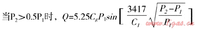 由以上公式可以看出當(dāng)P2>0.5P1時,調(diào)壓器進(jìn)、出口壓力變化都會引起調(diào)壓器通過能力的變化;但當(dāng)P2≤0.5P1時,調(diào)壓器的通過能力與出口壓力無關(guān),僅與進(jìn)口壓力有關(guān)。調(diào)壓器出口壓力一般是定值,為下游城市燃?xì)夤芫W(wǎng)的最高運(yùn)行壓力。因此,進(jìn)口壓力的變化對調(diào)壓器通過能力的影響較大。調(diào)壓器進(jìn)口與長輸管道相連,其變化不僅與氣源運(yùn)行工況有關(guān),也與城市儲氣方式有關(guān)。一般情況下進(jìn)入門站的天然氣壓力會在一定的范圍內(nèi)波動,如果進(jìn)、出壓差過大,調(diào)壓器的流通能力增大,小流量通過時產(chǎn)生脈動,因此,需要設(shè)置多級調(diào)壓系統(tǒng)。