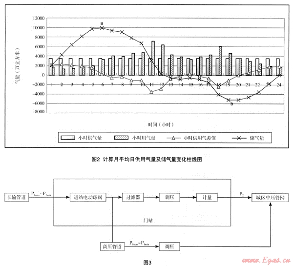 如果利用長輸管道末段儲氣,儲氣容積等于末段管路內(nèi)最高平均壓力和最低平均壓力下的氣體容積差。為保證最大的儲氣能力,長輸管道終點壓力即門站調(diào)壓器進(jìn)口壓力應(yīng)降低到最小值。通常調(diào)壓器正常工作的進(jìn)口最小壓力應(yīng)高于出口壓力0.05MPa。但同時調(diào)壓器進(jìn)口壓力降低,其通過能力隨之降低。為避免調(diào)壓器出現(xiàn)不穩(wěn)定的情況,一般設(shè)計按照城市高峰小時流量選調(diào)壓器尺寸,無疑會加大規(guī)格或者增加并聯(lián)調(diào)壓器數(shù)量,投資隨之加大。但末端壓力最低時并不是用氣高峰階段。圖2為某城市用氣量和儲氣量變化曲線圖。