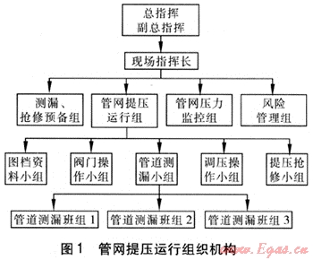 管網(wǎng)提壓運(yùn)行指揮部由公司分管運(yùn)行副總經(jīng)理任總指揮,分管工程副總經(jīng)理任副總指揮。指揮部下設(shè)管網(wǎng)提壓運(yùn)行組、管網(wǎng)壓力監(jiān)控組、測(cè)漏、搶修預(yù)備組、風(fēng)險(xiǎn)管理組,另外公司相關(guān)職能部門如財(cái)務(wù)、采購(gòu)、行政等管理部門按其職能給予配合。管網(wǎng)提壓運(yùn)行組,按工作職能具體劃分為閥門操作小組、調(diào)壓操作小組、提壓搶修小組、管道測(cè)漏小組、圖檔資料小組等5個(gè)小組。管道測(cè)漏小組根據(jù)區(qū)域管網(wǎng)提壓長(zhǎng)度及現(xiàn)有測(cè)漏人員和測(cè)漏儀器工具情況,可具體劃分為若干班組。管網(wǎng)提壓運(yùn)行組織機(jī)構(gòu)見(jiàn)圖1。