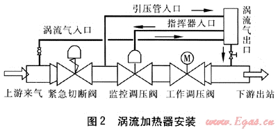 武漢西計(jì)量站來(lái)自西氣東輸淮武管道的天然氣壓力為5.0MPa,而下游供氣壓力約為1.4MPa。因此,在調(diào)壓分輸時(shí),存在較大的節(jié)流。調(diào)壓橇采用“緊急切斷閥+監(jiān)控調(diào)壓閥+工作調(diào)壓閥”的調(diào)壓模式。監(jiān)控調(diào)壓閥的指揮執(zhí)行機(jī)構(gòu)主要由預(yù)調(diào)器和指揮器組成,預(yù)調(diào)器和指揮器中均存在節(jié)流。調(diào)壓橇工作時(shí),由于指揮器的出口氣體溫度較低,且天然氣本身含有水或水合物,低溫時(shí)水容易冷凝成冰,堵塞指揮器閥口,造成調(diào)壓橇工作失效。原來(lái)主要采取電加熱的方法防止冰堵,現(xiàn)采用雙通道渦流加熱器取代電加熱器。該雙通道渦流加熱器設(shè)計(jì)的工作壓力為6.9MPa,試驗(yàn)壓力為10.3MPa,加熱功率隨上下游壓比的變化而變化。雙通道渦流加熱器可以同時(shí)加熱2路天然氣,即1臺(tái)加熱器可以同時(shí)為2臺(tái)調(diào)壓閥指揮器加熱。渦流加熱器安裝見(jiàn)圖2。渦流加熱器的渦流氣出口溫度較低,因此渦流氣出口與下游管道之間的連接應(yīng)盡量短,出口管徑盡量大,彎頭盡量少(最好為直管段),以防止出口管道發(fā)生冰堵。在出口處需安裝一個(gè)節(jié)流閥來(lái)控制渦流氣流量,以控制加熱溫度。在渦流加熱器渦流氣進(jìn)口處安裝一個(gè)直徑為12.7mm的小球閥,便于控制渦流加熱器的工作。從上游引壓管引入的高壓天然氣經(jīng)過(guò)渦流加熱器加熱后,進(jìn)入調(diào)壓閥指揮器。在指揮器節(jié)流降溫后,天然氣的溫度仍然高于工作狀態(tài)下天然氣的水露點(diǎn),有效地防止了冰堵。渦流加熱器安裝簡(jiǎn)單,所有連接處均可采用卡套接頭連接[5]。