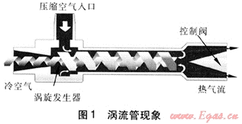 渦流管又稱(chēng)Ranque Hilsch管,是一個(gè)沒(méi)有運(yùn)動(dòng)部件、結(jié)構(gòu)非常簡(jiǎn)單的能量分離裝置[1]。氣體在降壓過(guò)程中,經(jīng)過(guò)特殊設(shè)計(jì)的渦流管時(shí),可以分為冷熱兩股氣流,這種現(xiàn)象稱(chēng)為渦流管現(xiàn)象,見(jiàn)圖1。