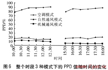 整個(gè)時(shí)段3種模式下的PPD值隨時(shí)間的變化見圖6。由圖6可知,自然通風(fēng)模式下PPD值在下午時(shí)段達(dá)到20.3%;機(jī)械通風(fēng)模式下除個(gè)別時(shí)刻外,大部分時(shí)間PPD值都在10%以下;空調(diào)模式下的PPD值高達(dá)80%以上。由此說明,在重慶地區(qū)過渡季節(jié)開啟空調(diào)并沒有給室內(nèi)創(chuàng)造令人滿意的熱環(huán)境。