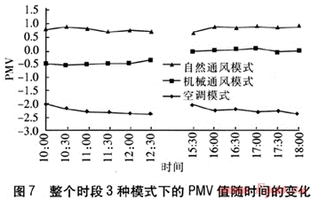 整個(gè)時(shí)段3種模式下的PMV值隨時(shí)間的變化見圖7。由圖7可知,3種模式的PMV值差別較為顯著,自然通風(fēng)模式下PMV值在0.5以上;空調(diào)模式下達(dá)到-2.0以下,偏離最佳熱舒適度的程度很大;采用機(jī)械通風(fēng)模式,上午時(shí)段的PMV平均值為-0.53,下午時(shí)段約為0,比上午時(shí)段更加接近最優(yōu)熱舒適度。