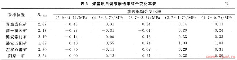 把煤基質(zhì)正、負(fù)效應(yīng)進行疊加,即可得到煤基質(zhì)自調(diào)節(jié)綜合滲透率變化率結(jié)果(表3)。