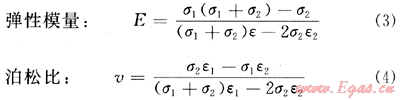 式中:E為彈性模量;v為泊松比;σ1、σ2、σ3為三軸壓力,其中σ1表示垂向壓力,實驗中指軸壓,σ2、σ3表示水平壓力,實驗中指圍壓,在假三軸力學(xué)實驗中,;σ2=σ3;ε1為垂向應(yīng)變,實驗指軸向應(yīng)變;ε2橫向應(yīng)變,實驗指平均徑向應(yīng)變。