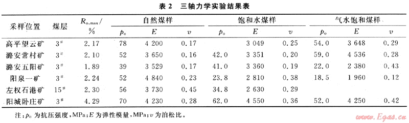 煤層氣開發(fā)均是在地下一定深度范圍內(nèi)進行,人們更為關(guān)心的是原地應(yīng)力條件下煤的力學(xué)性質(zhì),即飽和水、氣煤樣在圍限壓力下的力學(xué)行為和應(yīng)力-應(yīng)變關(guān)系所表現(xiàn)出的變形特征。在煤儲層所處地應(yīng)力環(huán)境下,隨著煤層氣的開采,圍壓的變化很小,可以視為不變。因此,實驗采用假三軸來進行樣品參數(shù)的實驗。