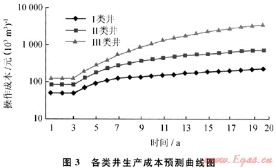 蘇里格氣田儲(chǔ)層非均質(zhì)性強(qiáng)烈,有效儲(chǔ)層規(guī)模小且變化大,本文參考文獻(xiàn)[1]、[2]對(duì)該氣田儲(chǔ)集層進(jìn)行了Ⅰ類(lèi)、Ⅱ類(lèi)、Ⅲ類(lèi)的分類(lèi)。其氣井生產(chǎn)特征如下:①單井產(chǎn)量低,壓力下降快;②氣井投產(chǎn)后,自然穩(wěn)產(chǎn)期短,早期遞減速度較快,后期較慢,單井經(jīng)濟(jì)累計(jì)產(chǎn)量?。虎蹥饩谧匀环€(wěn)產(chǎn)期,單位采氣成本較低,在遞減生產(chǎn)期后期單位采氣成本上升較快;④在低投資、低成本條件下,Ⅰ類(lèi)、Ⅱ類(lèi)井具有一定的經(jīng)濟(jì)效益,Ⅲ類(lèi)井在目前經(jīng)濟(jì)、技術(shù)條件下無(wú)經(jīng)濟(jì)效益。