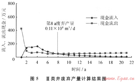 氣井20a評(píng)價(jià)期,在目前技術(shù)經(jīng)濟(jì)條件下,氣井生產(chǎn)到第8a時(shí),單井產(chǎn)量0.11×104m3/d,當(dāng)年現(xiàn)金流出60.86萬(wàn)元,當(dāng)年總銷(xiāo)售收入60.74萬(wàn)元(圖5)。為此,Ⅲ類(lèi)井的廢棄產(chǎn)量為0.11×104m3/d,經(jīng)濟(jì)生產(chǎn)期8a。
