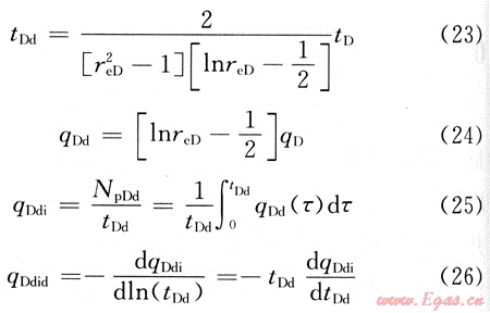 在繪制典型曲線前,對(duì)無(wú)量綱時(shí)間和無(wú)量綱產(chǎn)量進(jìn)行變換,引入如下變量[6]:
