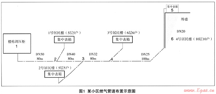 即管道通過區(qū)域調(diào)壓站或者樓棟調(diào)壓柜(箱)后,經(jīng)過底層集中表箱后沿建筑外墻引若干低壓上升立管分別進入各層用戶或經(jīng)過室內(nèi)總立管、各用戶支管和戶內(nèi)燃氣計量表引至末端設(shè)備的供氣方式。