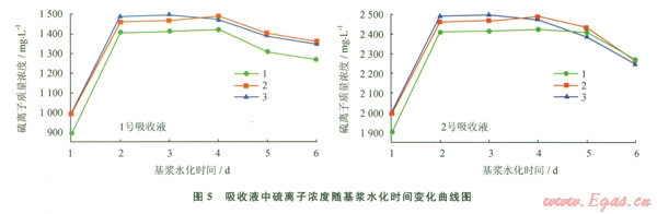 圖5中吸收液中硫離子濃度在基漿水化2 d后基本達到最大值,原因是此時膨潤土造漿效果最好,膨潤土比表面積較大;2~4 d內(nèi)吸收液中硫離子濃度無明顯變化;5~6 d吸收液中硫離子濃度開始降低。分析原因是基漿放置5 d后,底部有明顯的膨潤土固體分層現(xiàn)象,膠體穩(wěn)定性變差所致[7]。因此確定基漿最佳水化時間為2 d。
