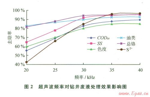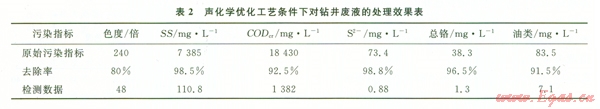從表2可以看出,經(jīng)過聲化學(xué)復(fù)合技術(shù)對鉆井廢液進(jìn)行處理后,其處理效果非常明顯,處理后所有的污染指標(biāo)濃度均下降大,其中總鉻、油類、色度、S-2達(dá)到一級排放標(biāo)準(zhǔn);SS達(dá)到二級排放標(biāo)準(zhǔn)。CODcr從18 430 mg/L降到l 382 mg/L,去除率達(dá)到92.5%。