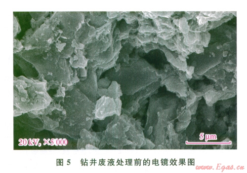 對鉆井廢液在超聲波作用前后進(jìn)行電鏡掃描分析,效果如圖5、6所示。