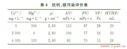 對(duì)可應(yīng)用于鹽膏層鉆井液來(lái)說(shuō),較強(qiáng)的抗鈣、鎂離子污染性能是其必須具備的基本性能。進(jìn)行了抗鈣、鎂污染評(píng)價(jià),試驗(yàn)結(jié)果見表4。