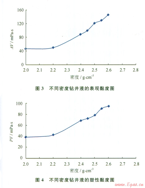 由圖3、4可知,鉆井液的黏度隨著密度的增大而升高,當(dāng)密度為