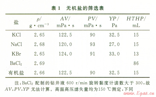 由表l數(shù)據(jù)可知:BaCl2與體系的配伍性差,加入BaCl2熱滾后體系明顯稠化、濾失增大;KBr價(jià)格較高;因此選用KCl、NaCl和有機(jī)鹽復(fù)配作為體系的抑制劑。