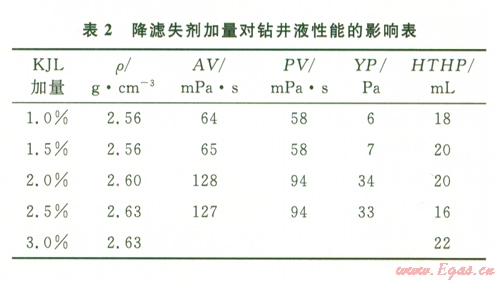 從表2可看出,KJl.加量低于2.0%時(shí),熱滾后出現(xiàn)沉淀,KJL加量高于2.5%時(shí),鉆井液黏切過(guò)高,從成本考慮,選用2.0%即可。