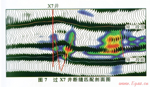 通過(guò)合成地震記錄標(biāo)定,確定X7井須三段鈣屑砂巖儲(chǔ)層為強(qiáng)振幅地震反射特征,砂體頂?shù)追謩e對(duì)應(yīng)強(qiáng)波峰或者強(qiáng)波谷;地震剖面上測(cè)試段砂體表現(xiàn)為“透鏡狀”反射特征,表明砂體為分流主河道砂體;X7井測(cè)試段東部