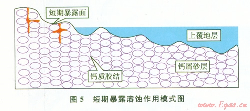 早期短期暴露溶蝕作用是指在砂巖沉積后,由于砂體處于短期的古地理高部位,短期內(nèi)后期沉積物沒有覆蓋到沉積地層,或者沉積后存在小范圍的不整合面,導(dǎo)致大氣淡水以及地表滲流水對(duì)易于溶蝕的鈣屑砂巖地層進(jìn)行溶蝕、滲透,在靠近地表地區(qū)形成一定規(guī)模的溶蝕縫洞系統(tǒng)(圖5)[5]。但早成巖階段形成的溶蝕縫洞規(guī)模有限,在中-晚期成巖階段容易被膠結(jié)、壓實(shí)、充填,對(duì)儲(chǔ)層孔隙建設(shè)的作用非常有限。