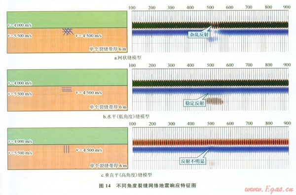 通過(guò)不同類型裂縫網(wǎng)絡(luò)模型正演(圖14):網(wǎng)狀裂縫具有典型的雜亂反射特征,而近水平裂縫表現(xiàn)為穩(wěn)定強(qiáng)反射特征,高角度垂直縫沒有明顯地震響應(yīng)。因此,利用“雜亂反射”屬性進(jìn)行須三段裂縫預(yù)測(cè)。