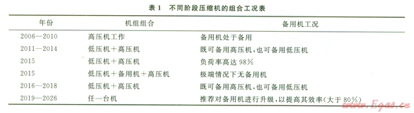 根據(jù)壓縮機(jī)的組合工況進(jìn)行機(jī)組串聯(lián)、切換工藝設(shè)計(jì)。機(jī)組切換、串聯(lián)時(shí)上級(jí)壓縮機(jī)組會(huì)對(duì)下一級(jí)機(jī)組產(chǎn)生巨大的沖擊,為此,利用機(jī)組喘振工藝,修改了濕氣壓縮機(jī)軟件,使用入口旋流分離器和出口海水冷卻器,通過喘振閥形成小循環(huán)把機(jī)組運(yùn)轉(zhuǎn)起來,實(shí)施精確控制,以實(shí)現(xiàn)多機(jī)組的切換和串聯(lián)運(yùn)行。不同階段壓縮機(jī)的組合工況見表l。