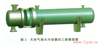 天然氣經(jīng)過濕氣壓縮機(jī)強(qiáng)力壓縮后,溫度升高,進(jìn)入下一道工藝流程前需要進(jìn)行冷卻降溫。天然氣海水冷卻器是利用清潔、環(huán)保、廉價(jià)的海水來冷卻天然氣的管殼式換熱裝置(圖2),采用管內(nèi)和管外單相強(qiáng)制對(duì)流換熱理論研制而成,是典型的間壁式換熱裝置。海水冷卻器受壓部件工作在海水和含C02濕天然氣的腐蝕環(huán)境中,所以,其良好的耐蝕性、抗振性和經(jīng)濟(jì)性是產(chǎn)品研制的關(guān)鍵技術(shù)問題。
