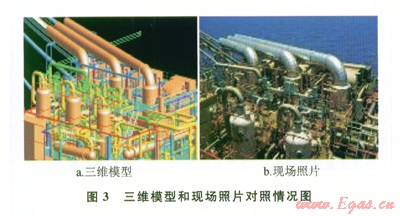 1)采用三維設(shè)計(jì)軟件PDMS搭建1:1的設(shè)備、結(jié)構(gòu)和管線模型。東方1-1氣田二期開發(fā)工程項(xiàng)目濕氣壓縮機(jī)工程引進(jìn)三維設(shè)計(jì)軟件PDMS,在項(xiàng)目的設(shè)計(jì)中避免了很多大尺寸管線、設(shè)備、支架的碰撞問題,方便指導(dǎo)項(xiàng)目施工作業(yè)。三維模型和現(xiàn)場(chǎng)照片對(duì)照情況見圖3。