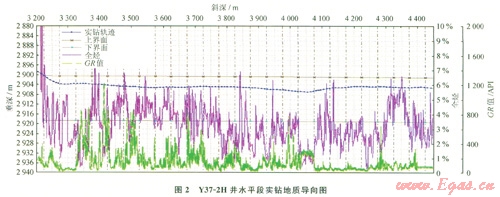 鉆井過(guò)程中實(shí)時(shí)利用隨鉆測(cè)井與綜合錄井,協(xié)助地質(zhì)工程師進(jìn)行地層精細(xì)評(píng)價(jià),準(zhǔn)確判斷地層[5],同時(shí),通過(guò)加強(qiáng)現(xiàn)場(chǎng)隨鉆地質(zhì)導(dǎo)向能力,在水平段的鉆井過(guò)程中及時(shí)準(zhǔn)確地確定地層傾角和儲(chǔ)層的地質(zhì)走向,通過(guò)伽馬和深、淺電阻率的探測(cè)深度及響應(yīng),建立地層預(yù)測(cè)數(shù)學(xué)模型,避免井眼軌跡的較大幅度調(diào)整。在確保了長(zhǎng)水平段有效延伸的前提下,實(shí)現(xiàn)了在儲(chǔ)層中鉆進(jìn),使水平段的儲(chǔ)層鉆遇率高達(dá)93.2%。實(shí)時(shí)指導(dǎo)井眼軌跡的幾何走向如圖2所示。