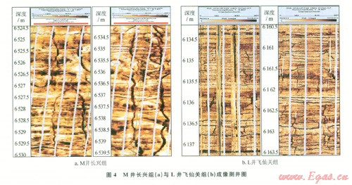 通過大量薄片照片觀察分析,元壩長興組的輸導體主要由白云巖、白云質灰?guī)r儲集體與裂縫構成(圖2-a)。根據儲層段巖心物性的統(tǒng)計分析(圖3-a),樣品點的滲透率值存在較多異常高值,分析認為與裂縫的發(fā)育情況有關。再結合成像測井來看(圖4-a),長興組礁蓋儲層成像測井動態(tài)圖像表現為塊狀、雜亂、裂縫及孔洞特征,高陡縫發(fā)育,水平縫次之,動態(tài)圖像的色級以黃褐色為主,少部分為亮白色,色級變化范圍較寬,但總體上色級以暗色段為主,故巖性較疏松,物性較好。裂縫與孔隙呈網狀交錯配置,高陡縫可有效溝通上下儲層,水平縫可使相對獨立的孔隙有效連通,從而有助于提高疏導體的立體疏導效率,增強儲層連通性,利于天然氣的有效運移、聚集成藏。