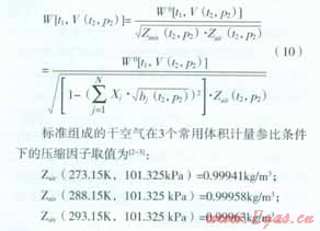 由于天然氣組分主要以甲烷為主,占總組分的80%-1 00%,而c3一c7等重烷烴組分比例很小,因而,結(jié)合表4和空氣壓縮因子Zair(t2,P2)數(shù)值,可以將式(10)簡化為: